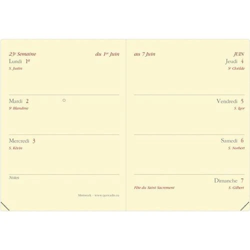 - Agenda civil semainier Miniweek Impala avec présentation de la semaine sur 2 pages à l’horizontale.