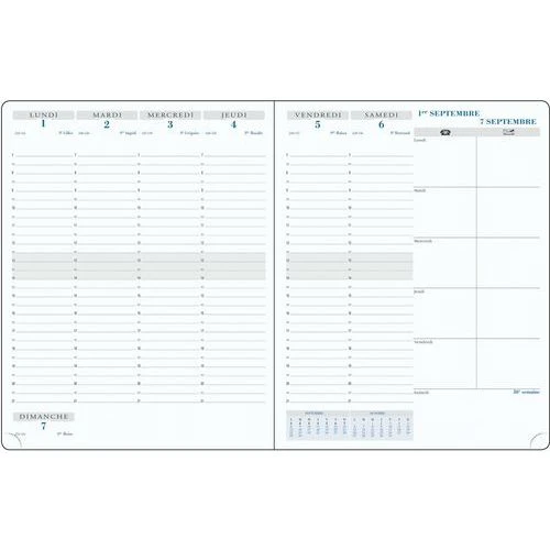 - La semaine sur 2 pages à la verticale, vision de la semaine d’un seul coup d’oeil, large amplitude horaire du lundi au samedi (7h à 21h), petit espace de notes le dimanche.