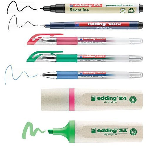 Étui personnel pour le bureau contenant : 1 edding 1800 Feutre fin de précision, 3 edding 2185 Roller à encre gel, 2 edding 24 EcoLine Surligneur, 1 edding 25 EcoLine Marqueur permanent.