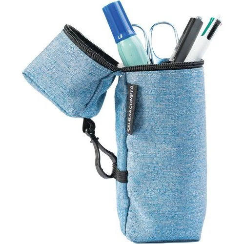 - La pince clip de la trousse permet deux usages : elle est pratique pour accrocher la trousse dans un sac et elle permet aussi de maintenir le capuchon ouvert en position pot à crayons.